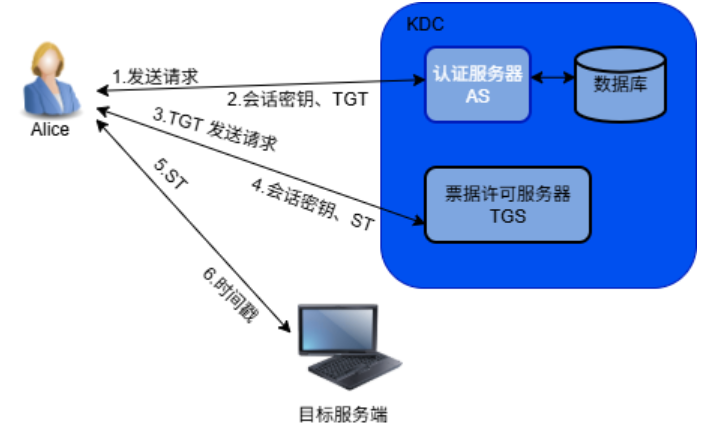 A 收到 KDC 的响应后,用自己的主密钥KA解密,得到会话密钥KS,以及 KDC 用 B 的主密钥加密的 “票据”。
