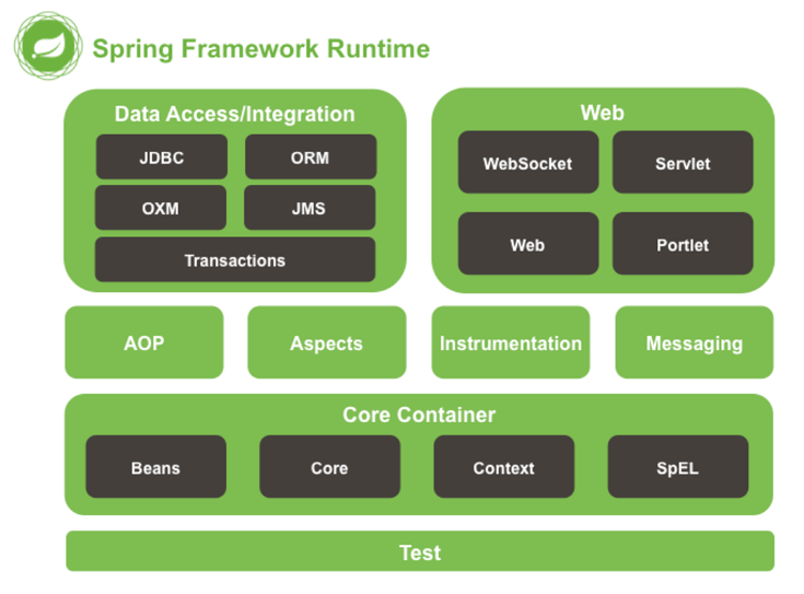 Spring的体系结构以核心容器为中心,通过模块化设计实现“功能分离、协同工作”。
