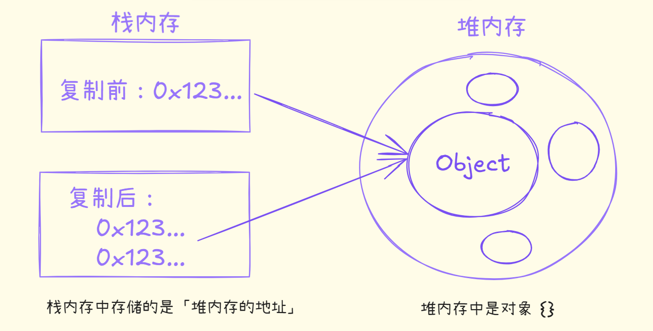 | 引用数据类型(复杂数据类型) | Object(包含子类型:Array、Function、Date、RegExp 等) | 1. 值存储在堆内存中,栈内存只存储堆内存的地址引用。 2. 赋值 / 传参时,传递的是地址引用的副本,修改新变量会影响原数据。 3. 类型复杂,大小不固定,可动态扩展属性 / 方法。 |