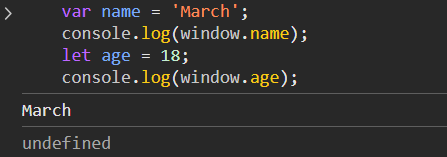 ◆与var关键字不同,使用let在全局作用域中声明的 变量不会成为window对象的属性(var声明的变量则会)。